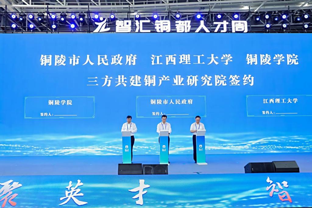 2025“智汇铜都”人才周活动在铜陵学院翠湖校区举行,活动以“铜聚英才、智创未来”为主题,精心设置了创优生态、创业赋能、创新协同、创赢未来等4个篇章,共20场专题特色引才聚才活动。启动仪式上,举行了完美网页版与铜陵市人民政府、铜陵学院三方共建铜产业研究院签约仪式,杨斌、孔涛、吴照明代表三方进行现场签约。据悉,铜产业研究院将发挥学校在有色金属等相关领域的教育资源优势以及铜陵市铜产业资源优势,打造集学科建设、技术研发、人才培养、成果转化等为一体的新型研发机构,推动铜基新材料、高端铜加工、绿色冶金等领域关键技术突破,促进铜产业高端化、绿色化、智能化转型。