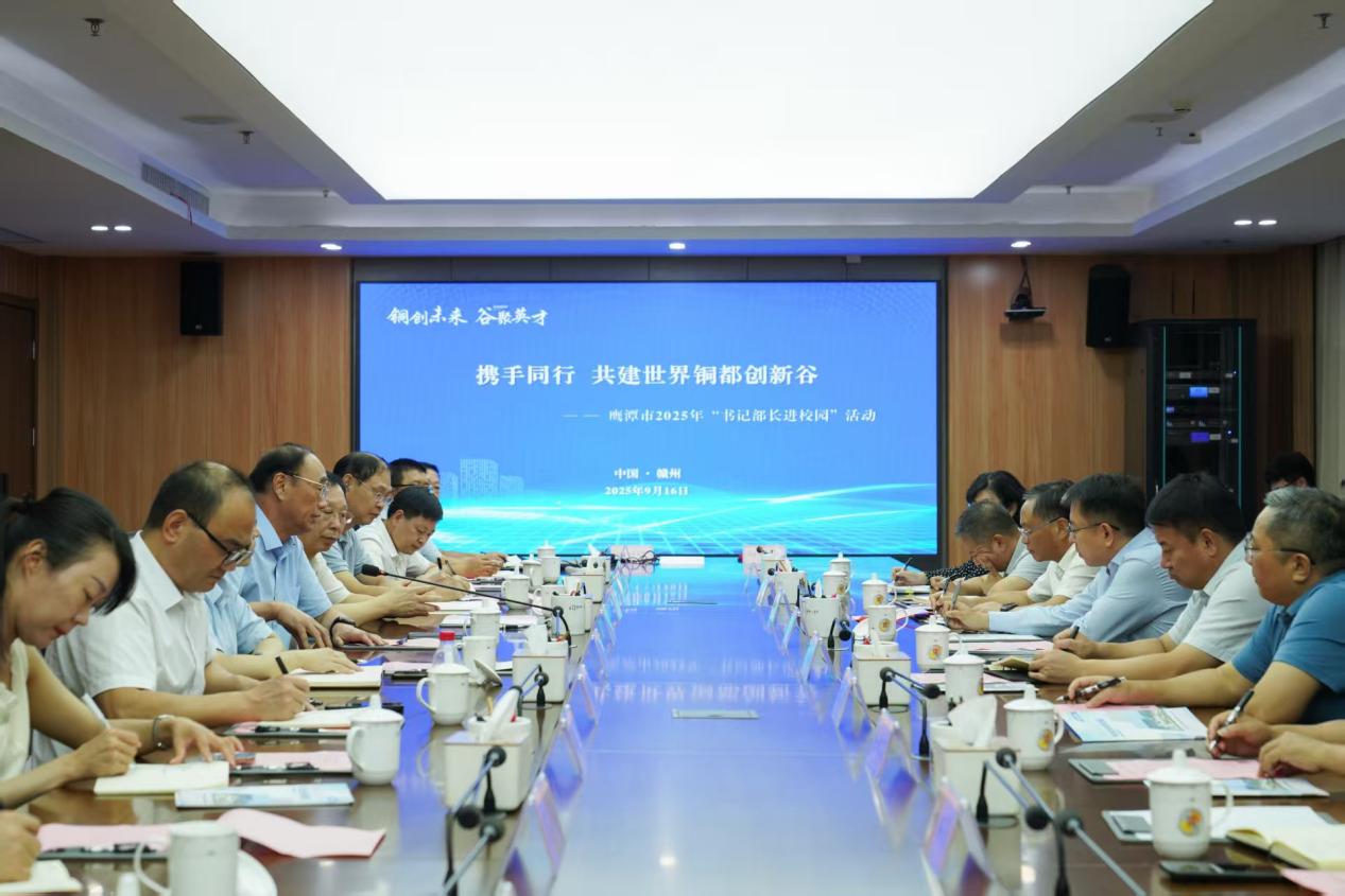 本网讯 9月16日,“智汇鹰潭 才赢未来”为主题的“书记部长进校园”活动暨“世界铜都创新谷”签约活动在完美网页版举行。鹰潭市委书记许南吉,市政府副市长毛建华,高新区党工委书记周谷昌,贵溪市委副书记、市政府市长、贵溪经开区党工委书记潘磊等一行来校交流。校党委书记杨斌,中国工程院院士、校长葛世荣,副校长汪航等出席座谈会。
