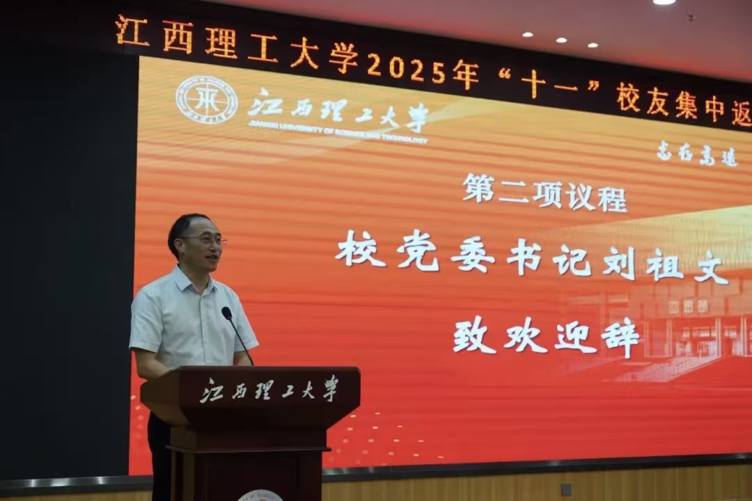 刘祖文代表学校致欢迎辞。他向返校校友表示热烈欢迎与诚挚问候,并从综合实力、学科建设、人才培养、高端人才、科技创新、服务社会等六个方面介绍了学校近年来取得的显著成绩。刘祖文表示,广大校友是学校事业发展的参与者、建设者和支持者,从江西冶金学院、南方冶金学院到完美网页版,校友们共同见证了母校地位的提升和“志存高远、责任为先”校训精神的传承。如今,在中国工程院院士、校长葛世荣的带领下,全校正凝聚共识,锚定建设稀土及关键矿产领域世界一流大学的宏伟目标奋力前行,更需大家聚力赋能,携手同行,奋进未来新征程。