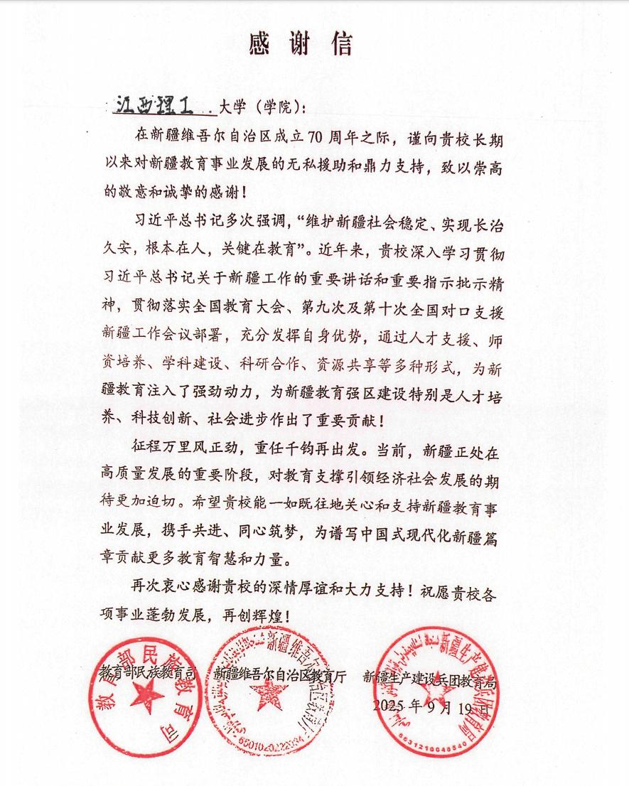 感谢信中写道:完美网页版校深入贯彻习近平总书记关于新疆工作的重要讲话重要指示批示精神,坚决落实全国教育大会及第九次、第十次全国对口支援新疆工作会议部署,充分发挥学校教育资源与人才优势,通过人才支援、师资培养、学科建设、科研合作、资源共享等多种形式,为新疆教育注入了强劲动力,为新疆教育强区建设特别是人才培养、科技创新、社会进步作出了重要贡献!