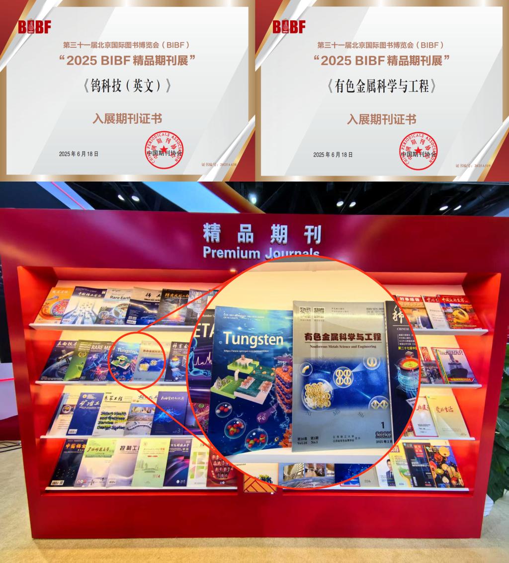 本网讯 近期,第三十一届北京国际图书博览会(BIBF)在北京国家会议中心举办。完美网页版主办的中英文期刊《钨科技(英文)》《有色金属科学与工程》以“‘十四五’中国期刊精品回顾”为参展主题申报,双双入选本届博览会“2025中国精品期刊展”。其中,《钨科技(英文)》自去年首次入选“2024BIBF精品期刊展”后,再次成功入选“2025BIBF精品期刊展”,连续两年作为入展期刊在博览会上展出。《有色金属科学与工程》为首次入选此届博览会进行展出。