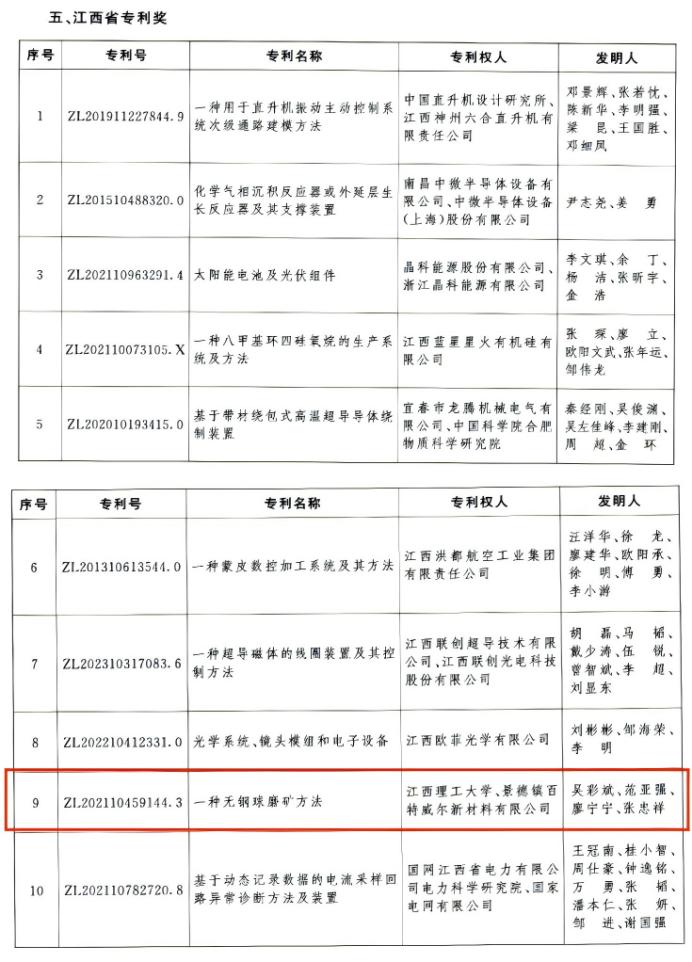 其中,由吴彩斌教授带领的矿物加工团队研发的专利《一种无钢球研磨方法》(专利号:ZL202110459144.3)荣获江西省专利奖,其创新技术为矿物加工领域的高效研磨提供了全新解决方案。