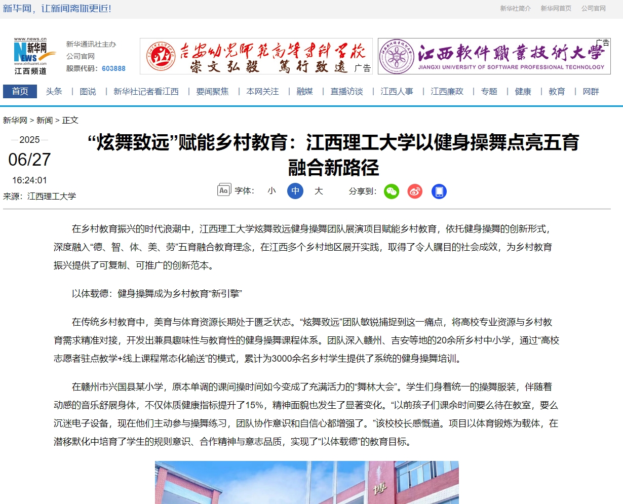 在乡村教育振兴的时代浪潮中,完美网页版炫舞致远健身操舞团队展演项目赋能乡村教育,依托健身操舞的创新形式,深度融入“德、智、体、美、劳”五育融合教育理念,在江西多个乡村地区展开实践,取得了令人瞩目的社会成效,为乡村教育振兴提供了可复制、可推广的创新范本。