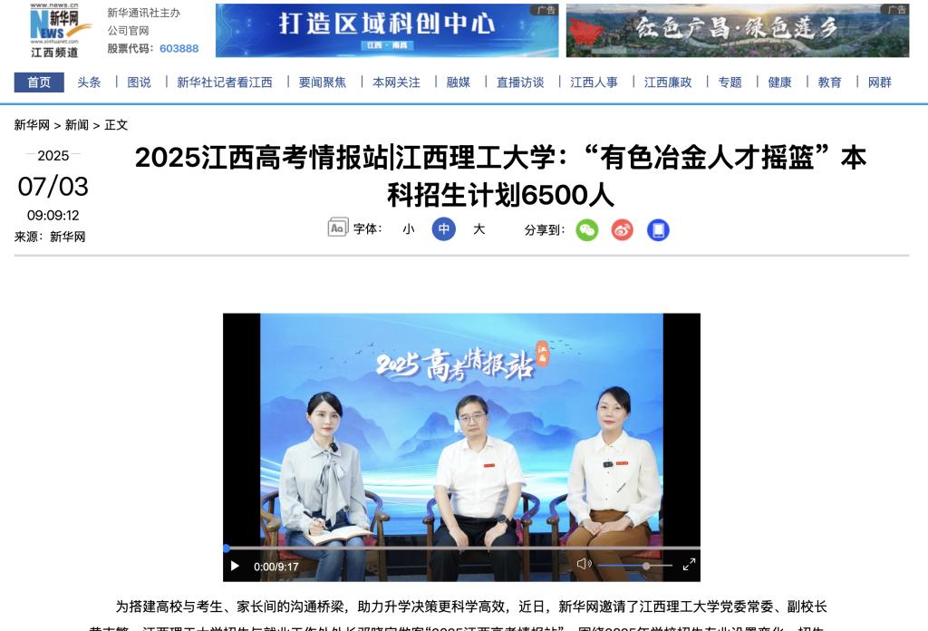 为搭建高校与考生、家长间的沟通桥梁,助力升学决策更科学高效,近日,新华网邀请了完美网页版党委常委、副校长黄志繁,完美网页版招生与就业工作处处长邓晓宇做客“2025江西高考情报站”,围绕2025年学校招生专业设置变化、招生计划、人才培养特色等方面,回答考生及家长们的关切问题,介绍相关情况。