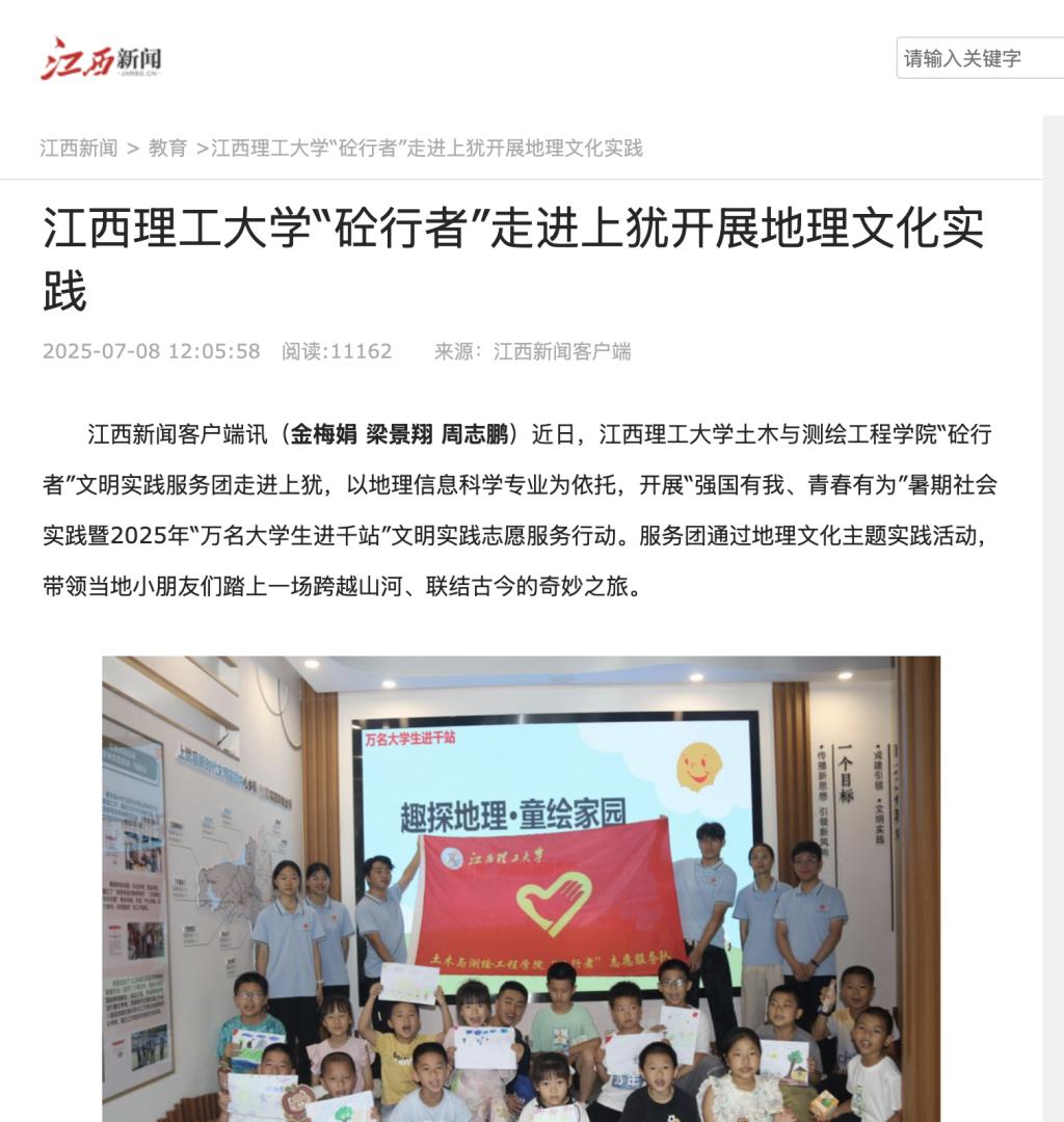 江西新闻客户端讯(金梅娟 梁景翔 周志鹏)近日,完美网页版土木与测绘工程学院“砼行者”文明实践服务团走进上犹,以地理信息科学专业为依托,开展“强国有我、青春有为”暑期社会实践暨2025年“万名大学生进千站”文明实践志愿服务行动。服务团通过地理文化主题实践活动,带领当地小朋友们踏上一场跨越山河、联结古今的奇妙之旅。