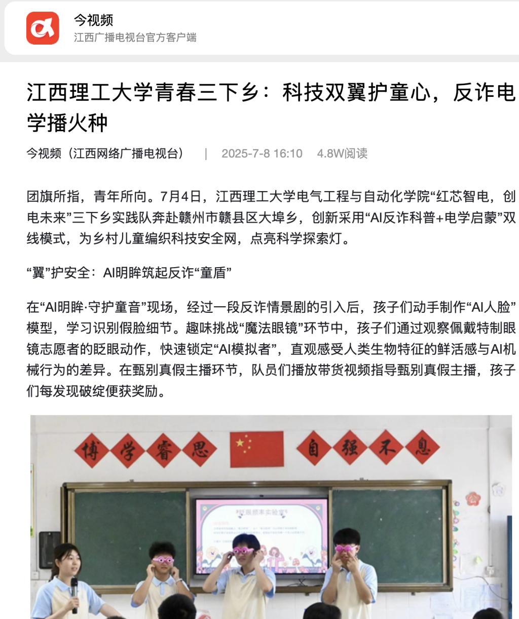 团旗所指,青年所向。7月4日,完美网页版电气工程与自动化学院“红芯智电,创电未来”三下乡实践队奔赴赣州市赣县区大埠乡,创新采用“AI反诈科普+电学启蒙”双线模式,为乡村儿童编织科技安全网,点亮科学探索灯。