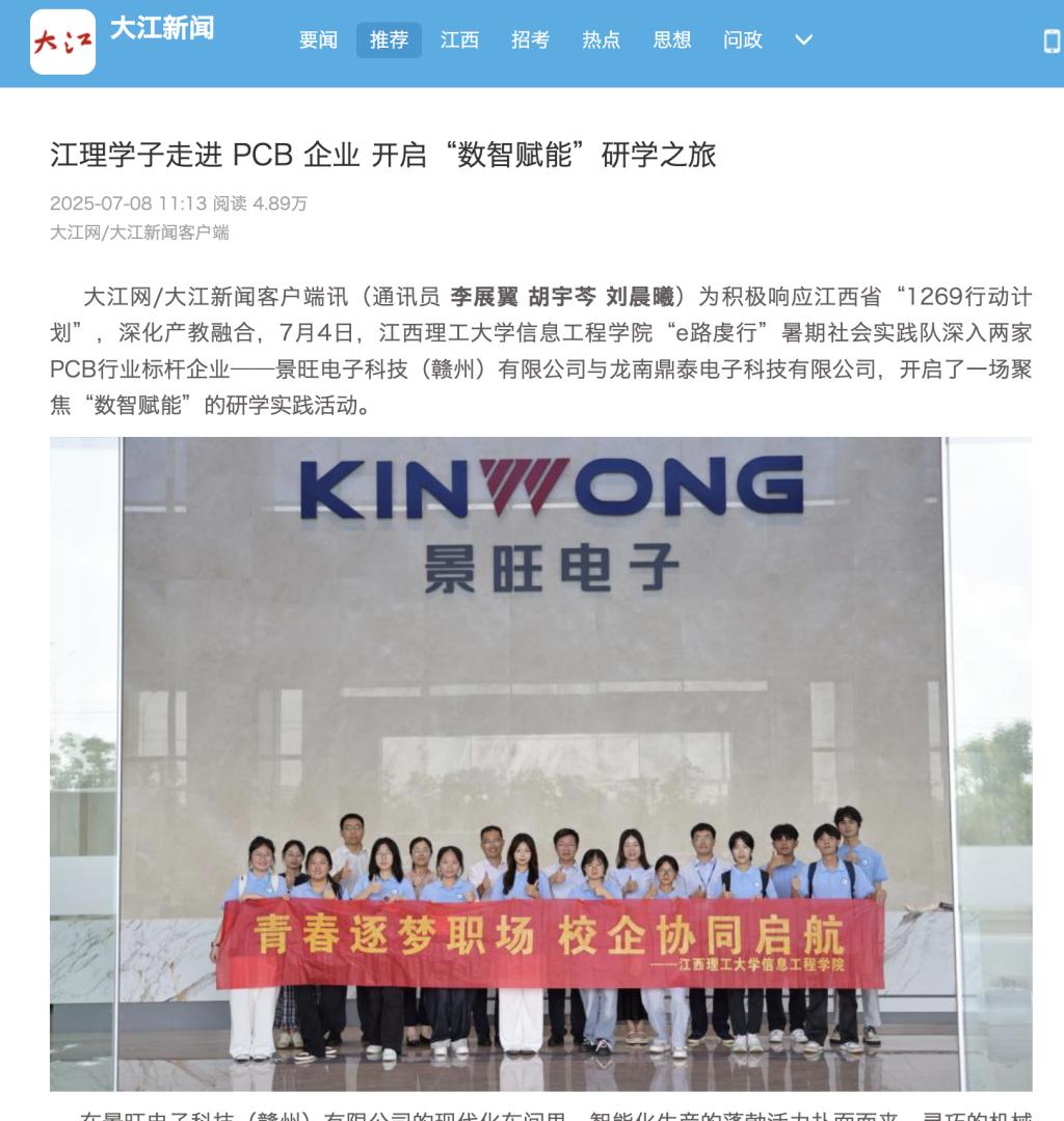 大江网/大江新闻客户端讯(通讯员李展翼 胡宇芩 刘晨曦)为积极响应江西省“1269行动计划”,深化产教融合,7月4日,完美网页版信息工程学院“e路虔行”暑期社会实践队深入两家PCB行业标杆企业——景旺电子科技(赣州)有限公司与龙南鼎泰电子科技有限公司,开启了一场聚焦“数智赋能”的研学实践活动。