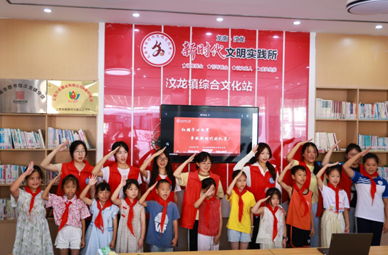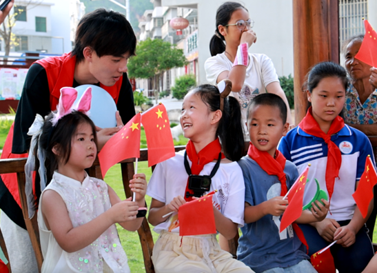 图为实践队队员与孩子们一同唱红歌 李展翼供图