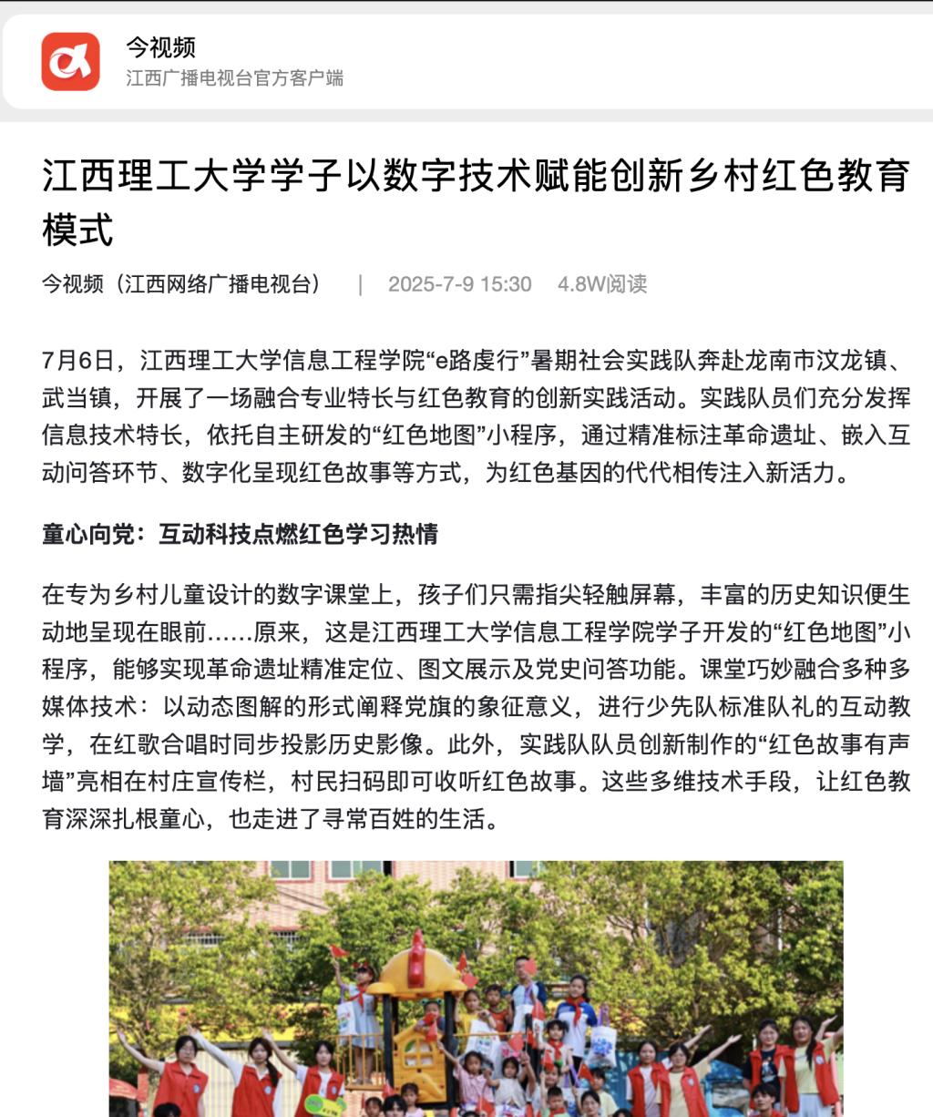 7月6日,完美网页版信息工程学院“e路虔行”暑期社会实践队奔赴龙南市汶龙镇、武当镇,开展了一场融合专业特长与红色教育的创新实践活动。实践队员们充分发挥信息技术特长,依托自主研发的“红色地图”小程序,通过精准标注革命遗址、嵌入互动问答环节、数字化呈现红色故事等方式,为红色基因的代代相传注入新活力。
