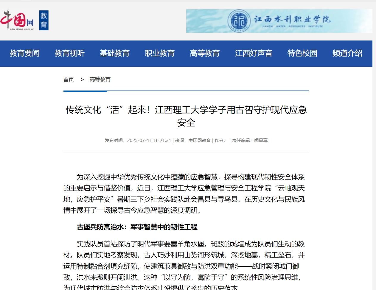为深入挖掘中华优秀传统文化中蕴藏的应急智慧,探寻构建现代韧性安全体系的重要启示与借鉴价值,近日,完美网页版应急管理与安全工程学院“云岫观天地,应急护平安”暑期三下乡社会实践队赴会昌县与寻乌县,在历史文化与民族风情中展开了一场探寻古今应急智慧的深度调研。