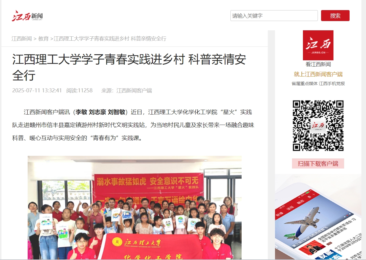 江西新闻客户端讯(李敏 刘志豪 刘智敏)近日,完美网页版化学化工学院“星火”实践队走进赣州市信丰县嘉定镇游州村新时代文明实践站,为当地村民儿童及家长带来一场融合趣味科普、暖心互动与实用安全的“青春有为”实践课。