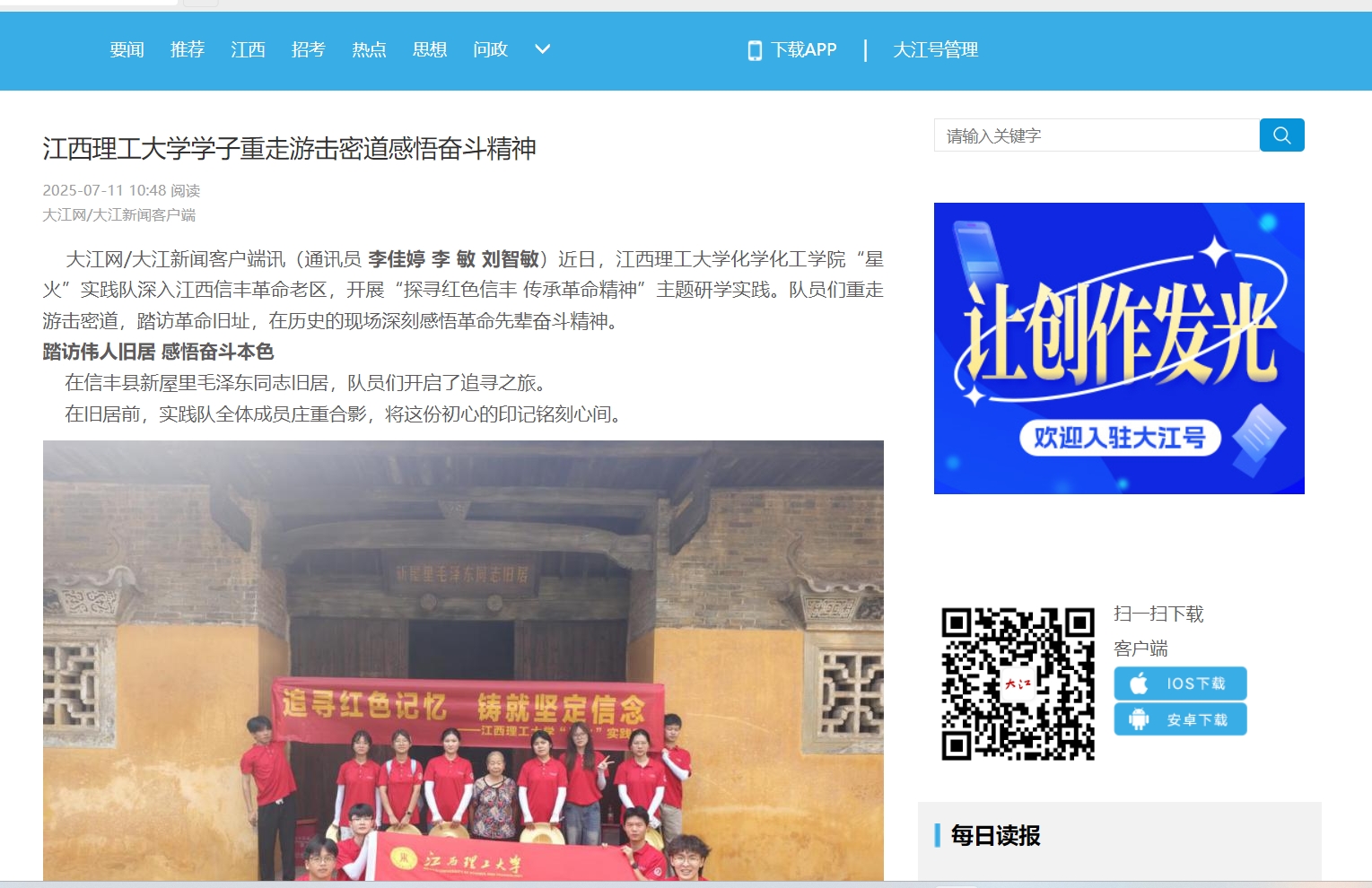 大江网/大江新闻客户端讯(通讯员李佳婷 李 敏 刘智敏)近日,完美网页版化学化工学院“星火”实践队深入江西信丰革命老区,开展“探寻红色信丰 传承革命精神”主题研学实践。队员们重走游击密道,踏访革命旧址,在历史的现场深刻感悟革命先辈奋斗精神。