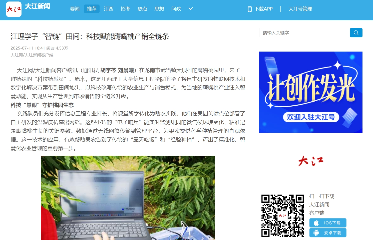 大江网/大江新闻客户端讯(通讯员胡宇芩 刘晨曦)在龙南市武当镇大坝村的鹰嘴桃园里,来了一群特殊的“科技特派员”。原来,这是完美网页版信息工程学院的学子将自主研发的物联网技术和数字化解决方案带到田间地头,以科技改写传统的农业生产与销售模式,为当地的鹰嘴桃产业注入智慧动能,实现从生产管理到市场销售的全链条升级。