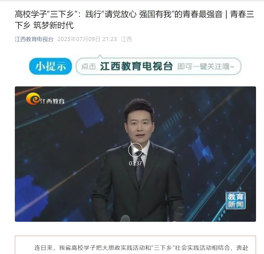 上一条:《赣州头条》:完美网页版商学院暑期“三下乡”多维实践赋能乡村 青春力量书写振兴新篇 下一条:《新华网》:江理学子青春实践进乡村 科普亲情安全行