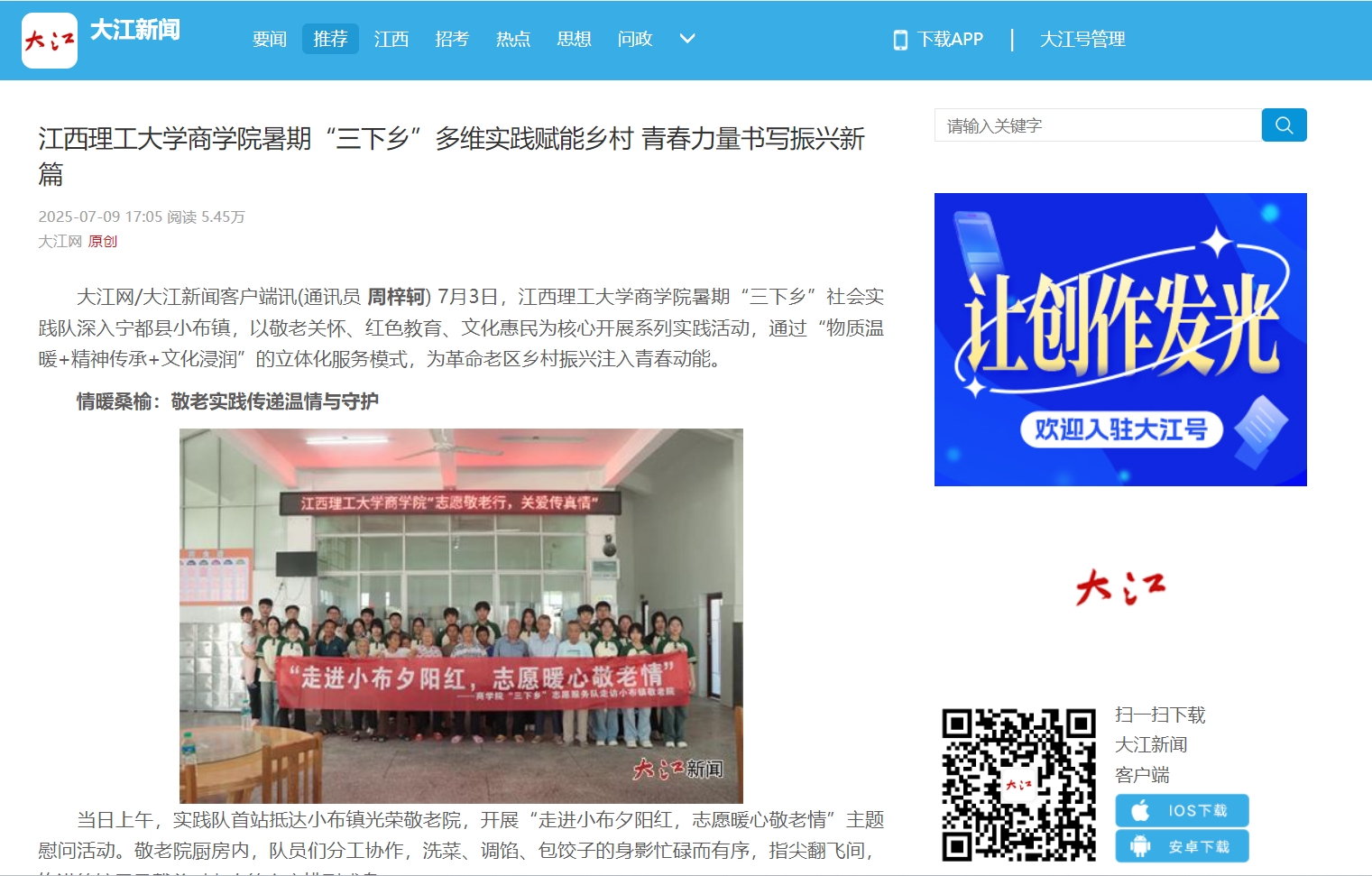 大江网/大江新闻客户端讯(通讯员周梓轲) 7月3日,完美网页版商学院暑期“三下乡”社会实践队深入宁都县小布镇,以敬老关怀、红色教育、文化惠民为核心开展系列实践活动,通过“物质温暖+精神传承+文化浸润”的立体化服务模式,为革命老区乡村振兴注入青春动能。