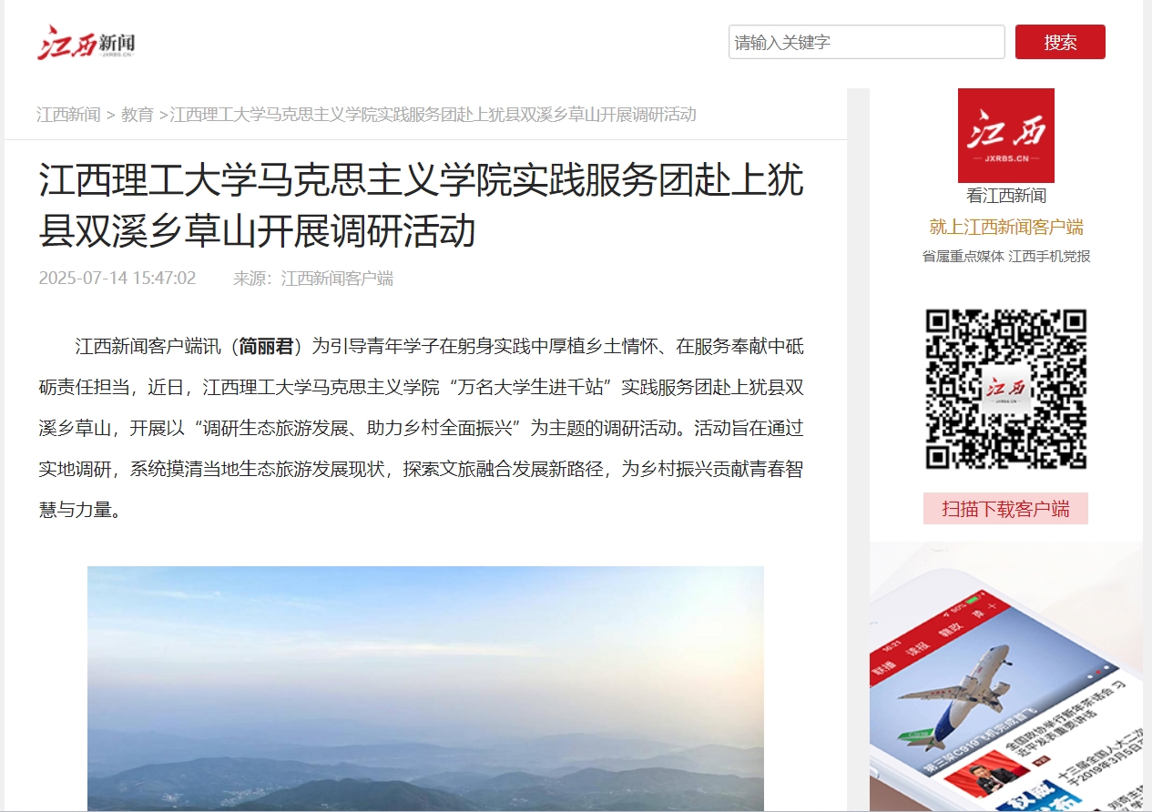 江西新闻客户端讯(简丽君)为引导青年学子在躬身实践中厚植乡土情怀、在服务奉献中砥砺责任担当,近日,完美网页版马克思主义学院“万名大学生进千站”实践服务团赴上犹县双溪乡草山,开展以“调研生态旅游发展、助力乡村全面振兴”为主题的调研活动。活动旨在通过实地调研,系统摸清当地生态旅游发展现状,探索文旅融合发展新路径,为乡村振兴贡献青春智慧与力量。