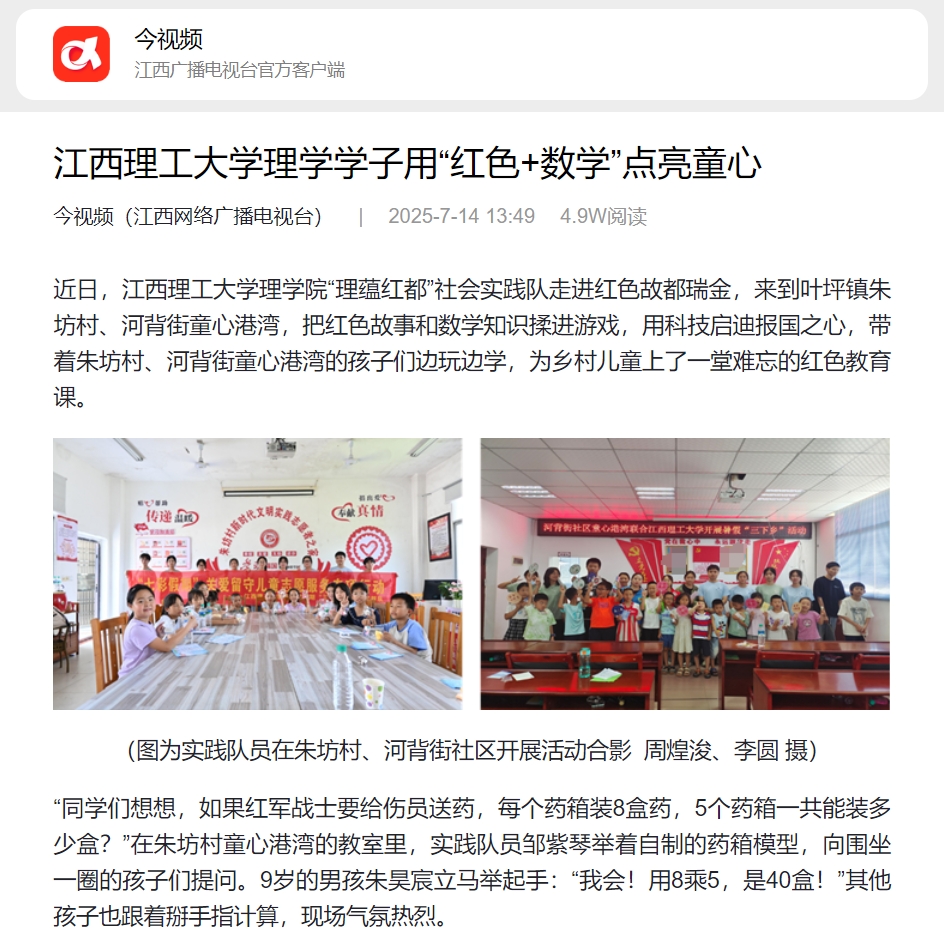 近日,完美网页版理学院“理蕴红都”社会实践队走进红色故都瑞金,来到叶坪镇朱坊村、河背街童心港湾,把红色故事和数学知识揉进游戏,用科技启迪报国之心,带着朱坊村、河背街童心港湾的孩子们边玩边学,为乡村儿童上了一堂难忘的红色教育课。