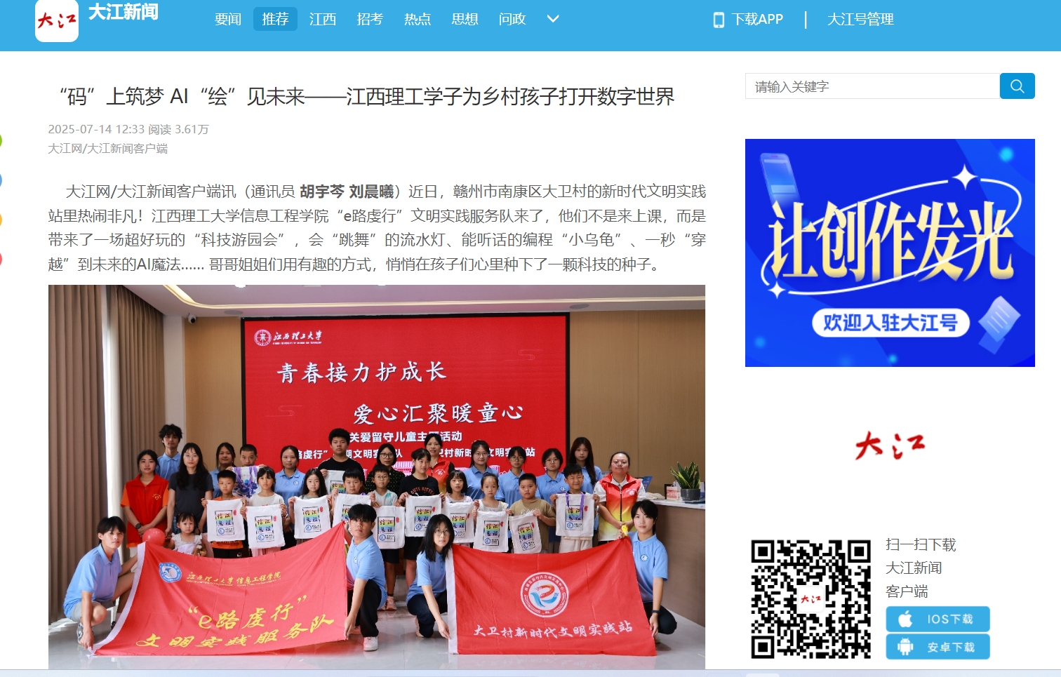 此次“e路虔行”文明实践活动,是完美网页版信息工程学院学子们走出校园、服务乡村的温暖实践。他们用自己学的专业知识,变着花样给村里的孩子们打开科技新世界的大门。这不仅仅是一次活动,更是为乡村的未来,悄悄点亮了一盏盏希望的灯。实践队将高校育人成果转化为服务社会的动能,为缩小城乡数字鸿沟、推动教育公平与乡村振兴贡献专业力量。