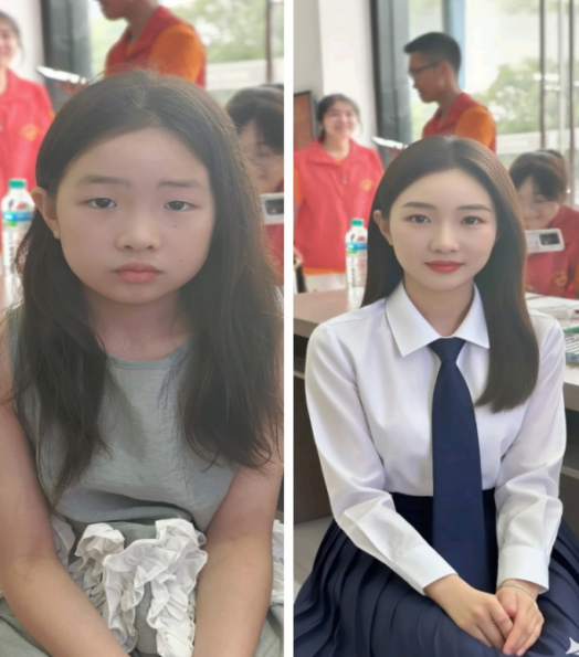 活动高潮,实践队员利用AI图像生成技术(AIGC)为孩子们制作“未来职业照”。当屏幕上实时呈现孩子们身着宇航服、白大褂、工程师制服等形象时,教室里充满了一声声惊叹:“哇!我是宇航员!”“看我的医生袍!”曾经模糊的职业理想,在AI赋能下变得栩栩如生。队员们表示:“这不仅是新奇体验,更希望用科技助力孩子们‘看见’梦想,在心中种下对未来的无限憧憬。”