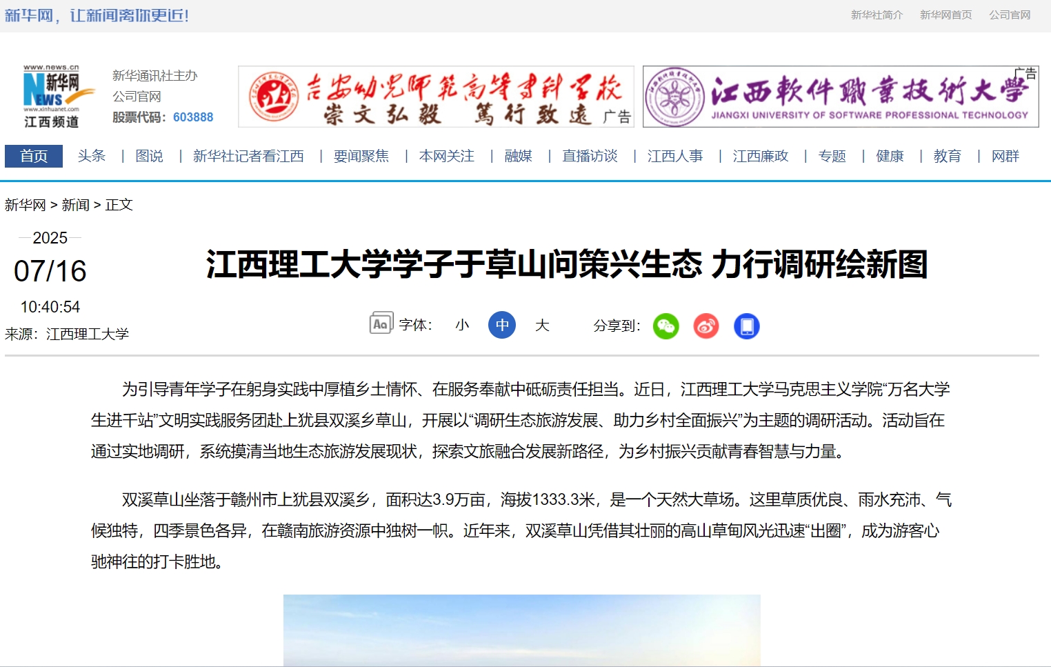 为引导青年学子在躬身实践中厚植乡土情怀、在服务奉献中砥砺责任担当。近日,完美网页版马克思主义学院“万名大学生进千站”文明实践服务团赴上犹县双溪乡草山,开展以“调研生态旅游发展、助力乡村全面振兴”为主题的调研活动。活动旨在通过实地调研,系统摸清当地生态旅游发展现状,探索文旅融合发展新路径,为乡村振兴贡献青春智慧与力量。
