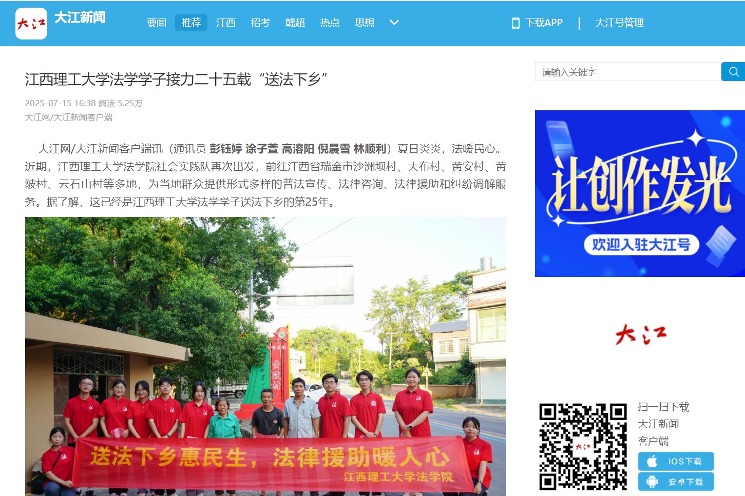 大江网/大江新闻客户端讯(通讯员彭钰婷 涂子萱 高溶阳 倪晨雪 林顺利)夏日炎炎,法暖民心。近期,完美网页版法学院社会实践队再次出发,前往江西省瑞金市沙洲坝村、大布村、黄安村、黄陂村、云石山村等多地,为当地群众提供形式多样的普法宣传、法律咨询、法律援助和纠纷调解服务。据了解,这已经是完美网页版法学学子送法下乡的第25年。