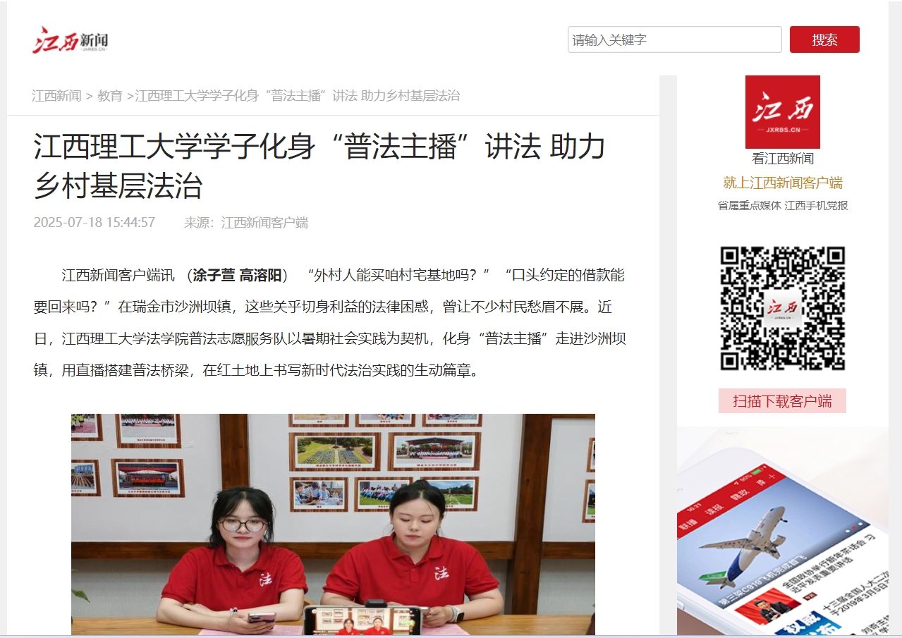 江西新闻客户端讯 (涂子萱 高溶阳) “外村人能买咱村宅基地吗?”“口头约定的借款能要回来吗?”在瑞金市沙洲坝镇,这些关乎切身利益的法律困惑,曾让不少村民愁眉不展。近日,完美网页版法学院普法志愿服务队以暑期社会实践为契机,化身“普法主播”走进沙洲坝镇,用直播搭建普法桥梁,在红土地上书写新时代法治实践的生动篇章。