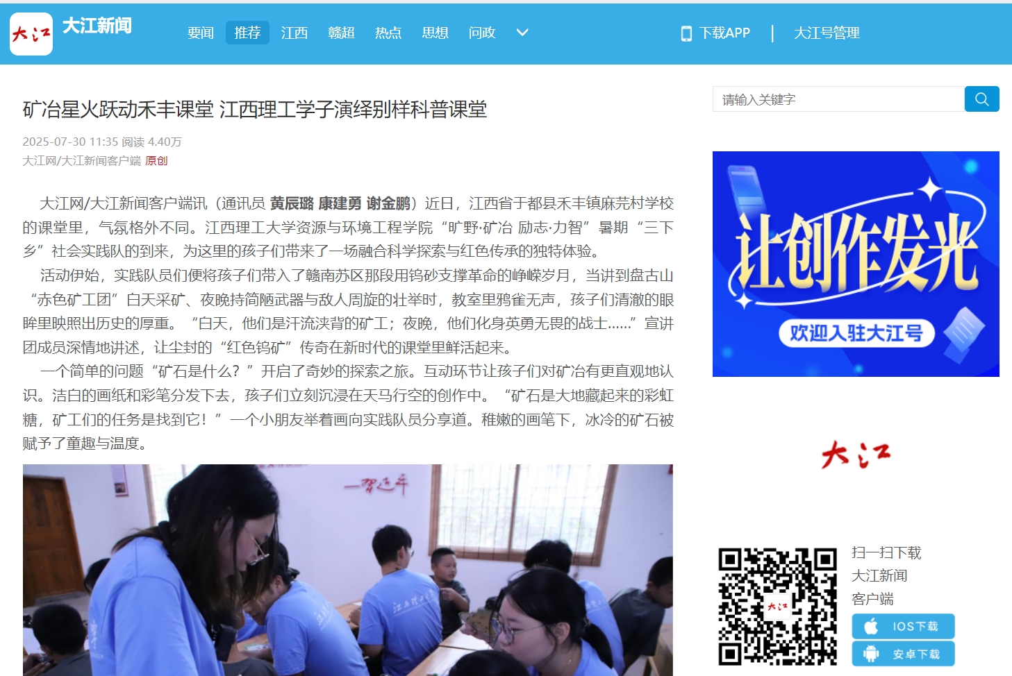 大江网/大江新闻客户端讯(通讯员黄辰璐 康建勇 谢金鹏)近日,江西省于都县禾丰镇麻芫村学校的课堂里,气氛格外不同。完美网页版资源与环境工程学院“旷野·矿冶 励志·力智”暑期“三下乡”社会实践队的到来,为这里的孩子们带来了一场融合科学探索与红色传承的独特体验。