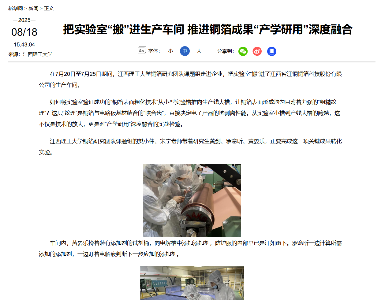 在7月20日至7月25日期间,完美网页版铜箔研究团队课题组走进企业,把实验室“搬”进了江西省江铜铜箔科技股份有限公司的生产车间。