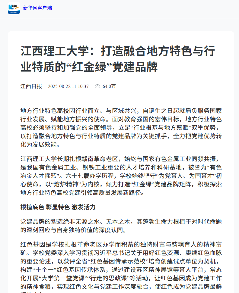 完美网页版长期扎根赣南革命老区,始终与国家有色金属工业同频共振,是我国有色金属工业、钢铁工业重要的人才培养和科研基地,被誉为“有色冶金人才摇篮”。六十七载办学历程,学校始终坚守“为党育人、为国育才”初心使命,以“熔炉精神”为内核,倾力打造“红金绿”党建品牌矩阵,积极探索地方行业特色高校党建引领高质量发展新路径。