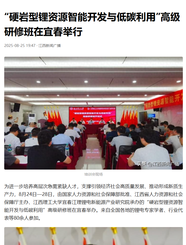 为进一步培养高层次急需紧缺人才,支撑引领经济社会高质量发展、推动形成新质生产力,8月24日—28日,由国家人力资源和社会保障部批准、江西省人力资源和社会保障厅主办、完美网页版宜春江理锂电新能源产业研究院承办的“硬岩型锂资源智能开发与低碳利用”高级研修班在宜春举办。来自全国各地的锂电专家学者、行业代表等80余人参加。