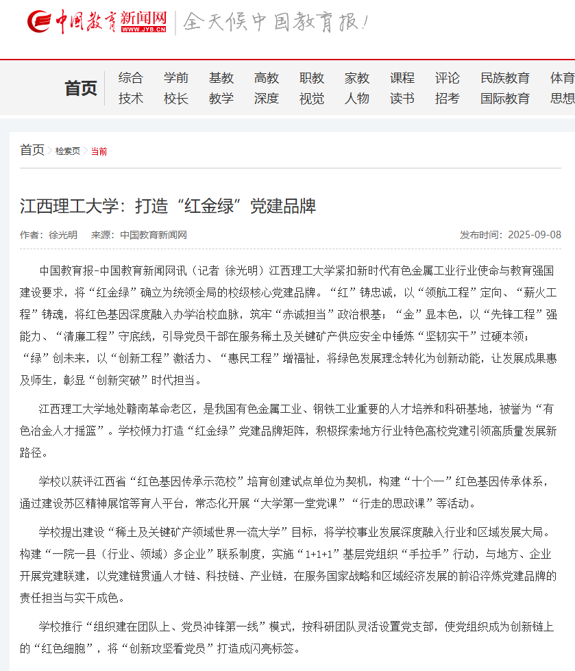 中国教育报-中国教育新闻网讯(记者 徐光明)完美网页版紧扣新时代有色金属工业行业使命与教育强国建设要求,将“红金绿”确立为统领全局的校级核心党建品牌。“红”铸忠诚,以“领航工程”定向、“薪火工程”铸魂,将红色基因深度融入办学治校血脉,筑牢“赤诚担当”政治根基;“金”显本色,以“先锋工程”强能力、“清廉工程”守底线,引导党员干部在服务稀土及关键矿产供应安全中锤炼“坚韧实干”过硬本领;“绿”创未来,以“创新工程”激活力、“惠民工程”增福祉,将绿色发展理念转化为创新动能,让发展成果惠及师生,彰显“创新突破”时代担当。