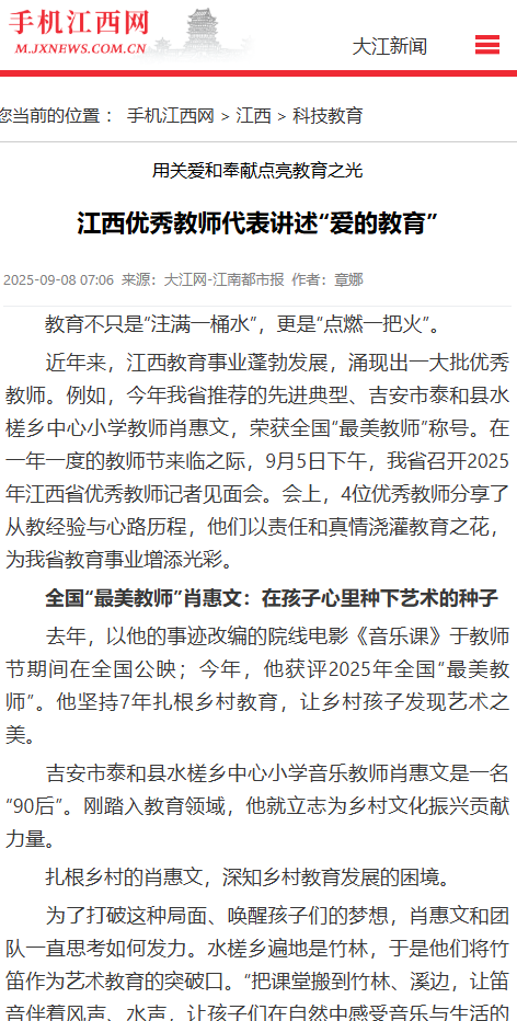 近年来,江西教育事业蓬勃发展,涌现出一大批优秀教师。例如,今年我省推荐的先进典型、吉安市泰和县水槎乡中心小学教师肖惠文,荣获全国“最美教师”称号。在一年一度的教师节来临之际,9月5日下午,我省召开2025年江西省优秀教师记者见面会。会上,4位优秀教师分享了从教经验与心路历程,他们以责任和真情浇灌教育之花,为我省教育事业增添光彩。