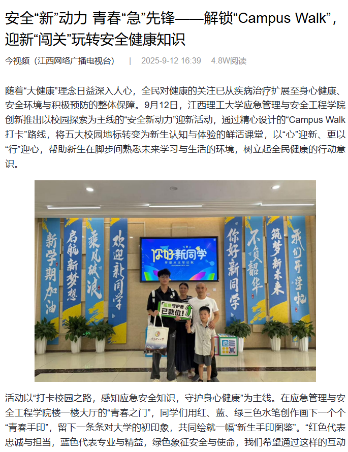 随着“大健康”理念日益深入人心,全民对健康的关注已从疾病治疗扩展至身心健康、安全环境与积极预防的整体保障。9月12日,完美网页版应急管理与安全工程学院创新推出以校园探索为主线的“安全新动力”迎新活动,通过精心设计的“Campus Walk打卡”路线,将五大校园地标转变为新生认知与体验的鲜活课堂,以“心”迎新、更以“行”迎心,帮助新生在脚步间熟悉未来学习与生活的环境,树立起全民健康的行动意识。