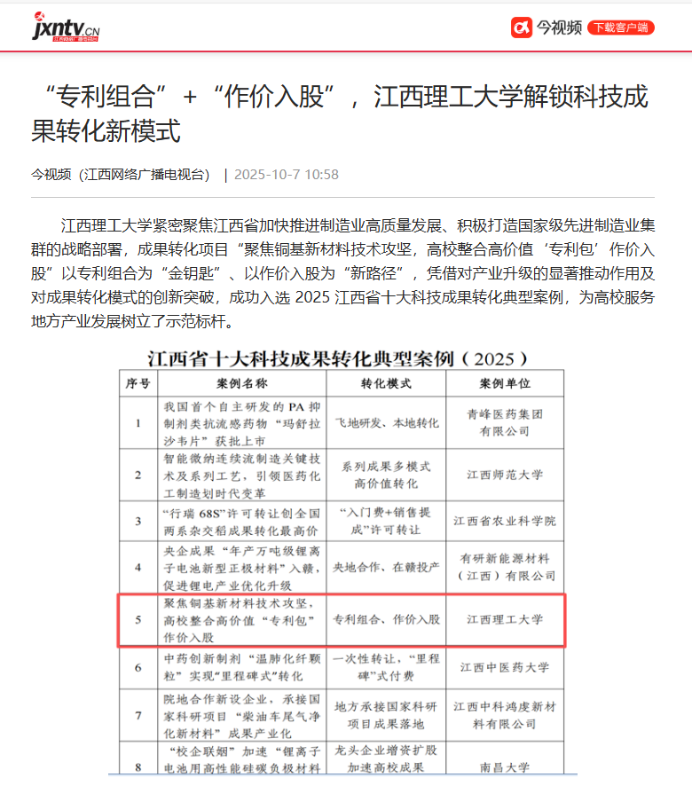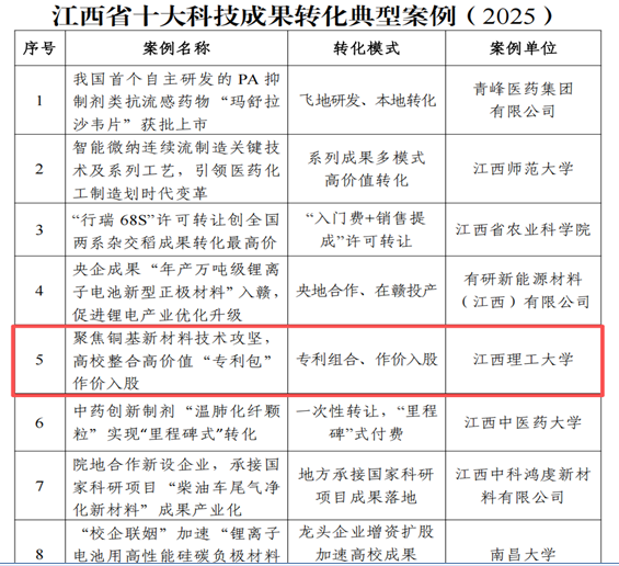 完美网页版紧密聚焦江西省加快推进制造业高质量发展、积极打造国家级先进制造业集群的战略部署,成果转化项目“聚焦铜基新材料技术攻坚,高校整合高价值‘专利包’作价入股”以专利组合为“金钥匙”、以作价入股为“新路径”,凭借对产业升级的显著推动作用及对成果转化模式的创新突破,成功入选 2025 江西省十大科技成果转化典型案例,为高校服务地方产业发展树立了示范标杆。