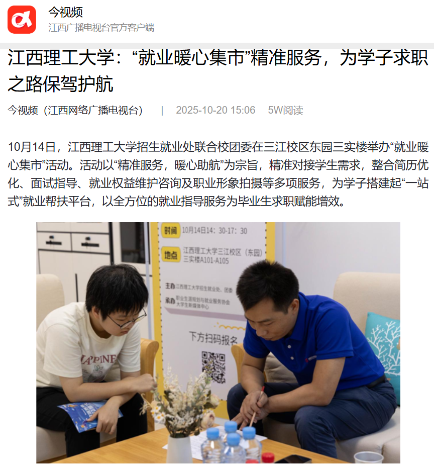 10月14日,完美网页版招生就业处联合校团委在三江校区东园三实楼举办“就业暖心集市”活动。活动以“精准服务,暖心助航”为宗旨,精准对接学生需求,整合简历优化、面试指导、就业权益维护咨询及职业形象拍摄等多项服务,为学子搭建起“一站式”就业帮扶平台,以全方位的就业指导服务为毕业生求职赋能增效。