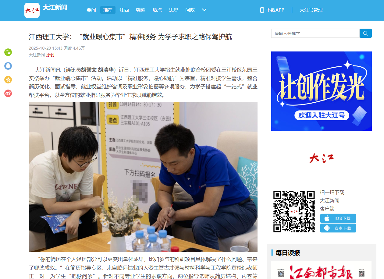 大江新闻讯(通讯员胡馨文 胡清华)近日,完美网页版招生就业处联合校团委在三江校区东园三实楼举办“就业暖心集市”活动。活动以“精准服务,暖心助航”为宗旨,精准对接学生需求,整合简历优化、面试指导、就业权益维护咨询及职业形象拍摄等多项服务,为学子搭建起“一站式”就业帮扶平台,以全方位的就业指导服务为毕业生求职赋能增效。