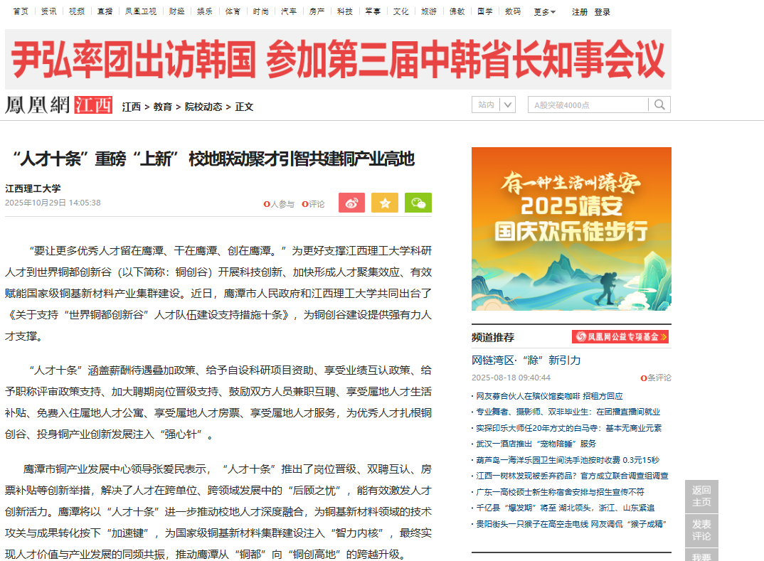 鹰潭市铜产业发展中心领导张爱民表示,“人才十条”推出了岗位晋级、双聘互认、房票补贴等创新举措,解决了人才在跨单位、跨领域发展中的“后顾之忧”,能有效激发人才创新活力。鹰潭将以“人才十条”进一步推动校地人才深度融合,为铜基新材料领域的技术攻关与成果转化按下“加速键”,为国家级铜基新材料集群建设注入“智力内核”,最终实现人才价值与产业发展的同频共振,推动鹰潭从“铜都”向“铜创高地”的跨越升级。