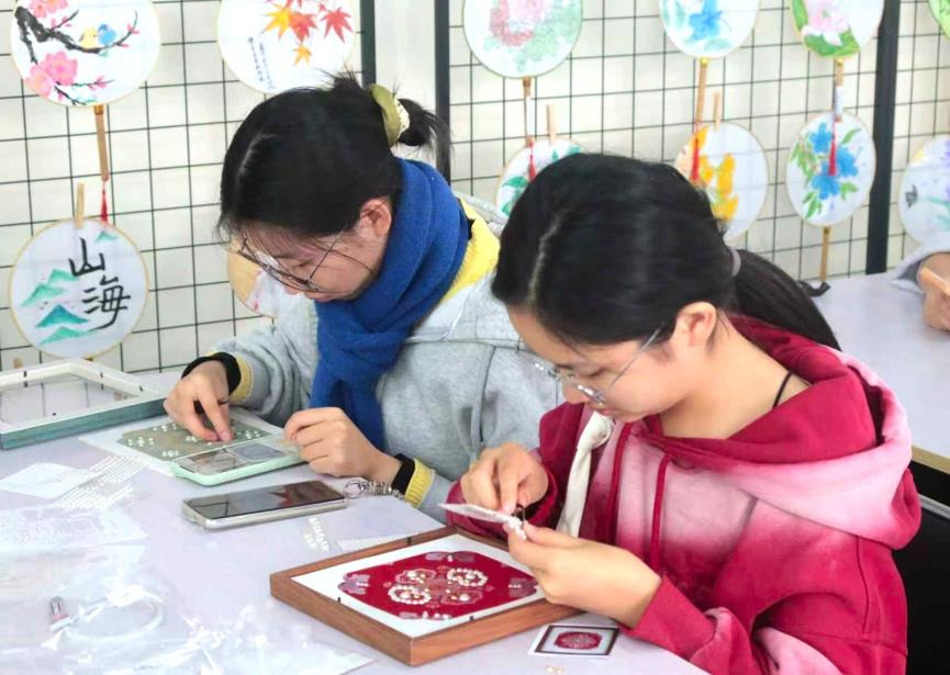 ▲完美网页版学生制作宋锦珍珠画 摄影丨王雨欣