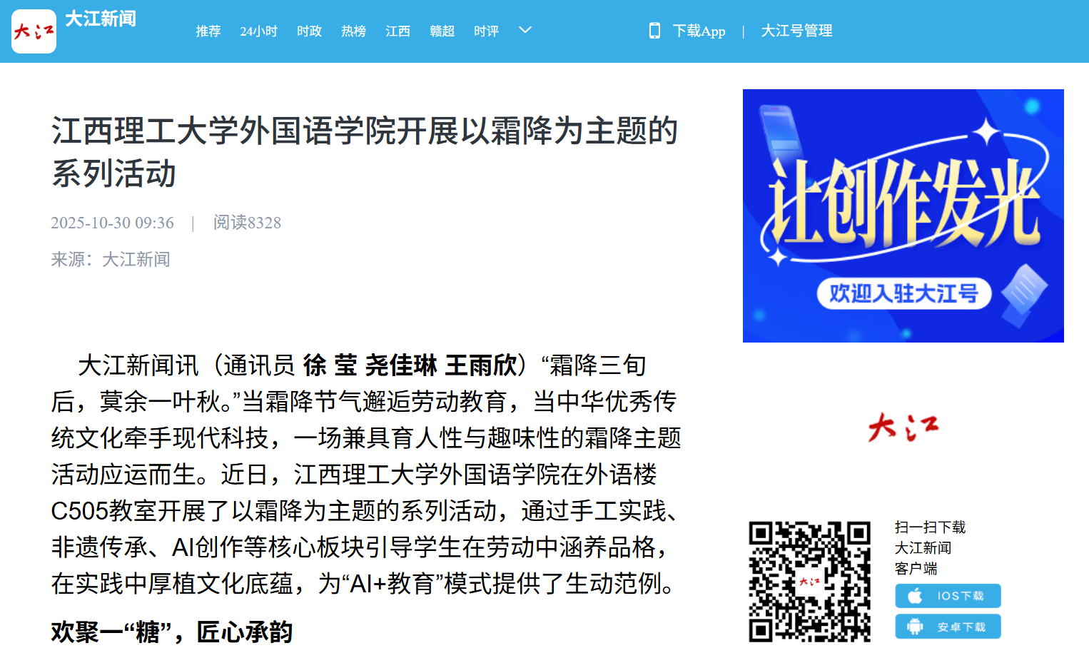 大江新闻讯(通讯员徐 莹 尧佳琳 王雨欣)“霜降三旬后,蓂余一叶秋。”当霜降节气邂逅劳动教育,当中华优秀传统文化牵手现代科技,一场兼具育人性与趣味性的霜降主题活动应运而生。近日,完美网页版外国语学院在外语楼C505教室开展了以霜降为主题的系列活动,通过手工实践、非遗传承、AI创作等核心板块引导学生在劳动中涵养品格,在实践中厚植文化底蕴,为“AI+教育”模式提供了生动范例。