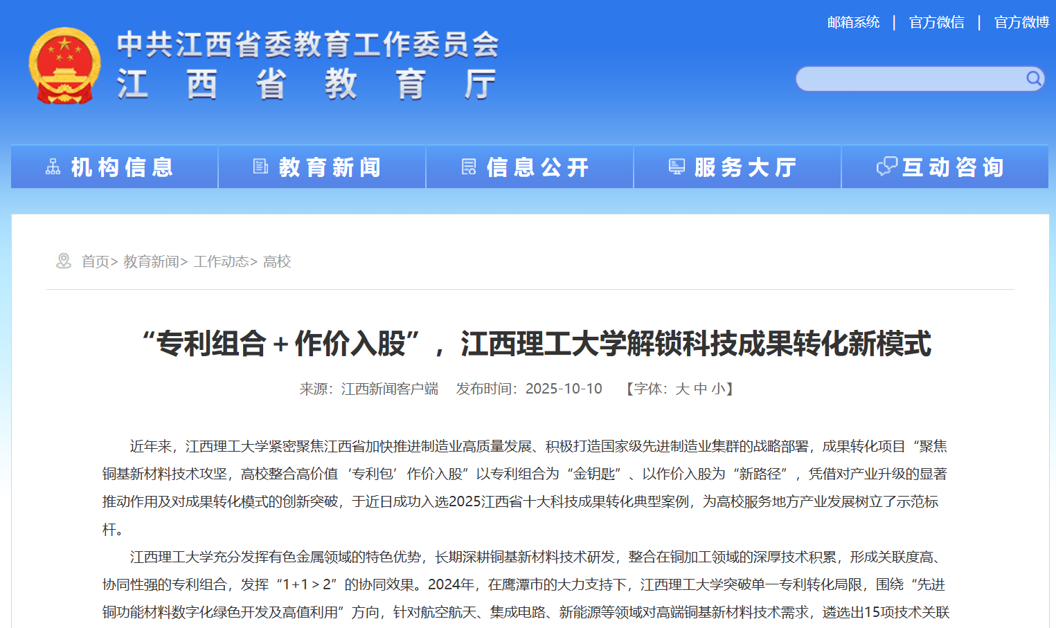 近年来,完美网页版紧密聚焦江西省加快推进制造业高质量发展、积极打造国家级先进制造业集群的战略部署,成果转化项目“聚焦铜基新材料技术攻坚,高校整合高价值‘专利包’作价入股”以专利组合为“金钥匙”、以作价入股为“新路径”,凭借对产业升级的显著推动作用及对成果转化模式的创新突破,于近日成功入选2025江西省十大科技成果转化典型案例,为高校服务地方产业发展树立了示范标杆。