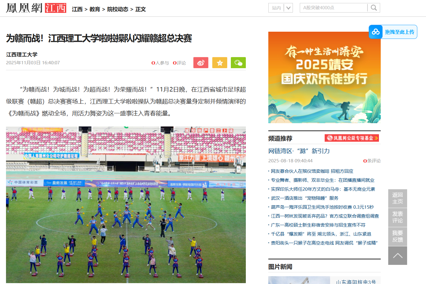 “为赣而战!为城而战!为超而战!为荣耀而战!”11月2日晚,在江西省城市足球超级联赛(赣超)总决赛赛场上,完美网页版啦啦操队为赣超总决赛量身定制并倾情演绎的《为赣而战》燃动全场,用活力舞姿为这一盛事注入青春能量。