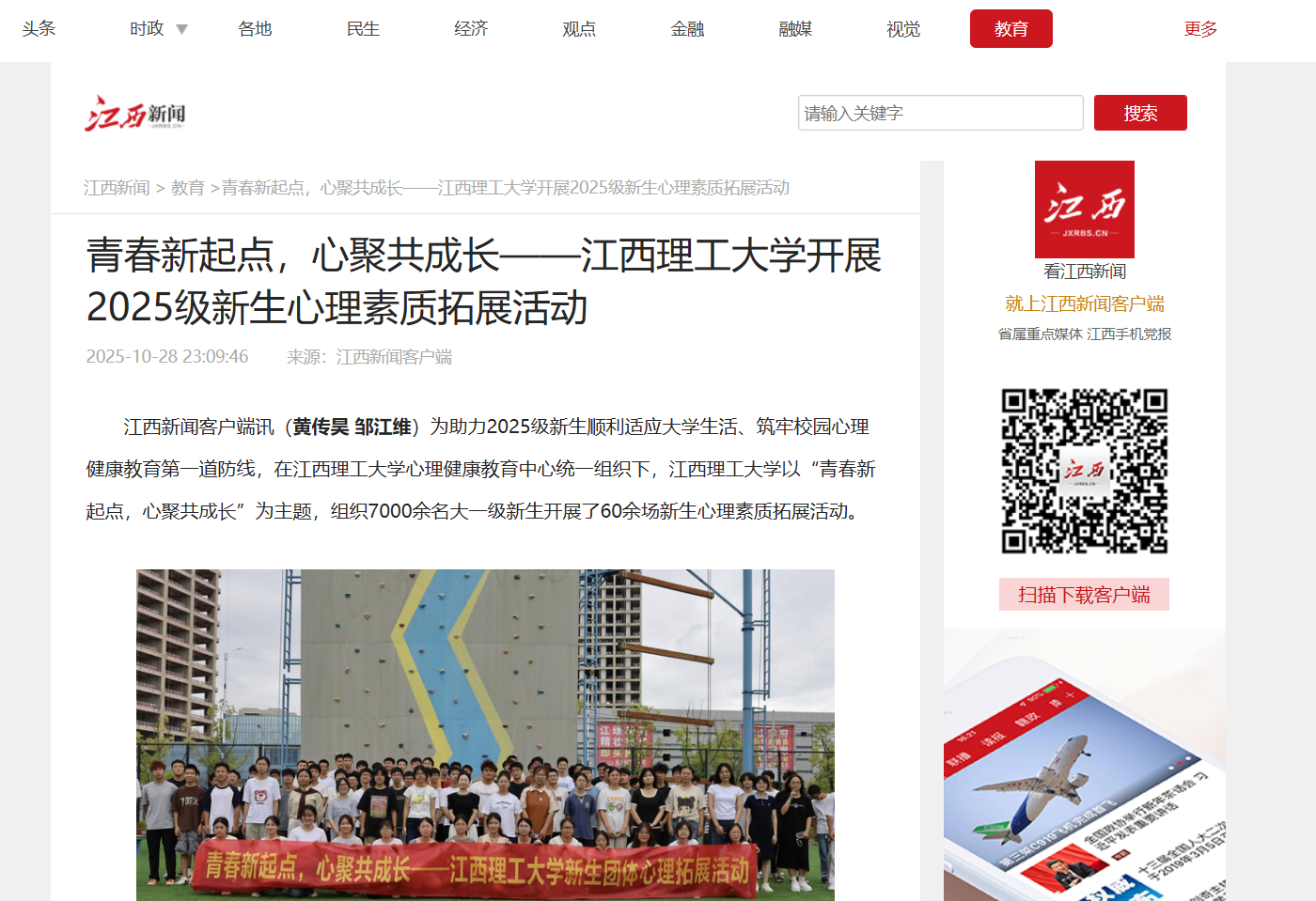 江西新闻客户端讯(黄传昊 邹江维)为助力2025级新生顺利适应大学生活、筑牢校园心理健康教育第一道防线,在完美网页版心理健康教育中心统一组织下,完美网页版以“青春新起点,心聚共成长”为主题,组织7000余名大一级新生开展了60余场新生心理素质拓展活动。