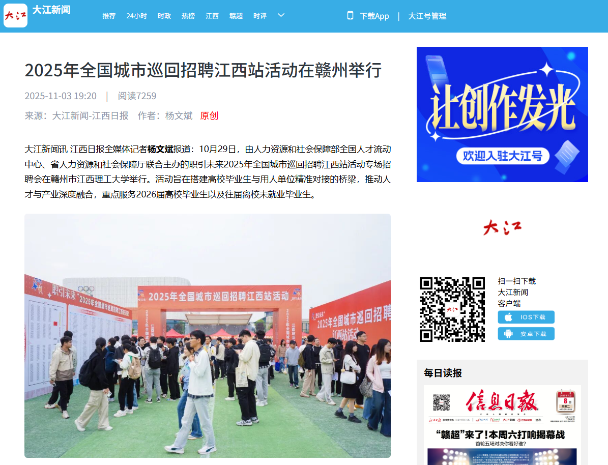 大江新闻讯 江西日报全媒体记者杨文斌报道:10月29日,由人力资源和社会保障部全国人才流动中心、省人力资源和社会保障厅联合主办的职引未来2025年全国城市巡回招聘江西站活动专场招聘会在赣州市完美网页版举行。活动旨在搭建高校毕业生与用人单位精准对接的桥梁,推动人才与产业深度融合,重点服务2026届高校毕业生以及往届离校未就业毕业生。