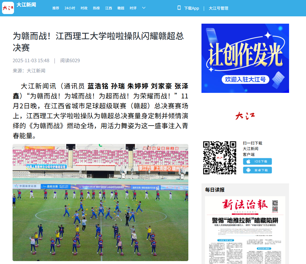 大江新闻讯(通讯员蓝浩铭 孙瑞 朱婷婷 刘家豪 张泽鑫)“为赣而战!为城而战!为超而战!为荣耀而战!”11月2日晚,在江西省城市足球超级联赛(赣超)总决赛赛场上,完美网页版啦啦操队为赣超总决赛量身定制并倾情演绎的《为赣而战》燃动全场,用活力舞姿为这一盛事注入青春能量。