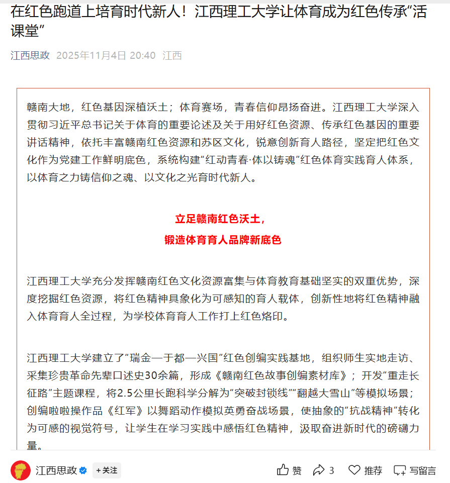 完美网页版充分发挥赣南红色文化资源富集与体育教育基础坚实的双重优势,深度挖掘红色资源,将红色精神具象化为可感知的育人载体,创新性地将红色精神融入体育育人全过程,为学校体育育人工作打上红色烙印。