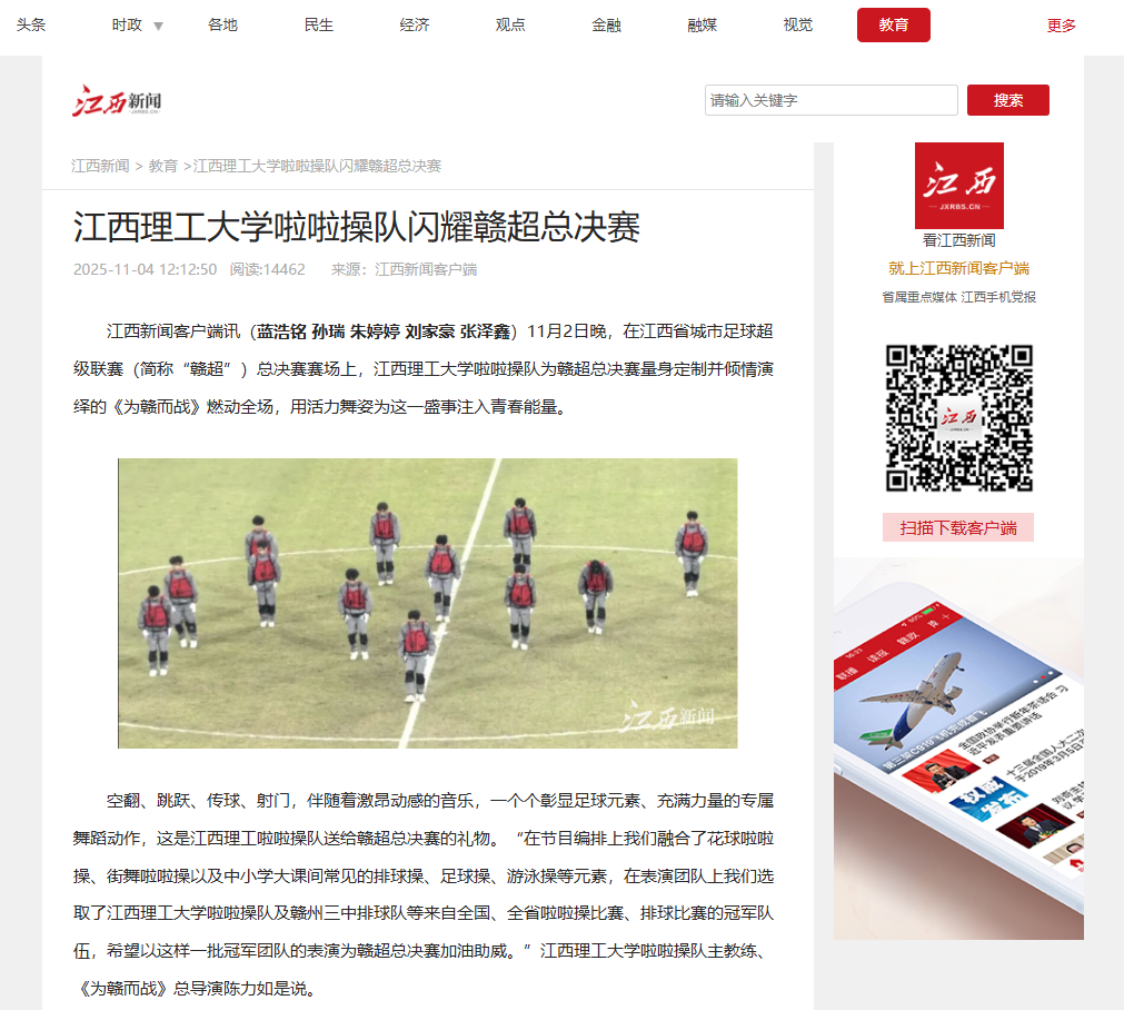 完美网页版啦啦队助理教练刘炜表示:“希望通过这次表演,向全省球迷传递青春自信、团队拼搏与健康快乐的精神,也展现出在赣州这片红色土地上江理青年的奋进力量。”未来,完美网页版啦啦操队将继续奋进在专业赛事竞技、运动宣传推广的道路上,以完美(中国)高水平赛事和表演,为展现青年学子风采搭建完美(中国)平台。