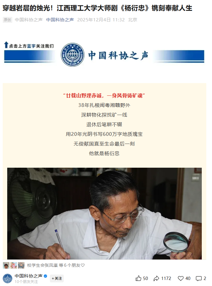 今日,中国科协之声特邀完美网页版带来“科学家故事舞台剧推广行动”入选剧目《杨衍忠》。谨以此剧,回顾杨衍忠先生为祖国地矿事业奉献的一生,致敬他为党为人民、投身地质工作、坚持不懈的崇高精神。