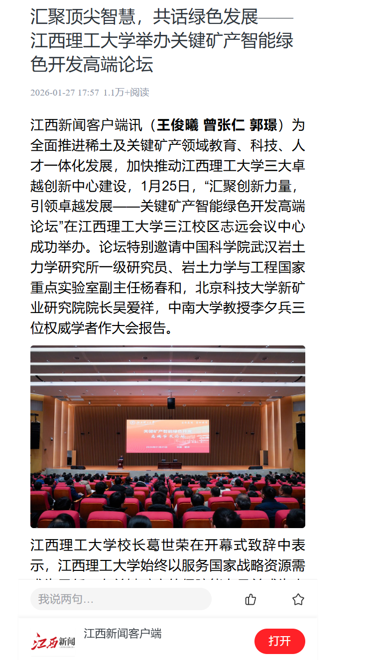 江西新闻客户端讯(王俊曦 曾张仁 郭璟)为全面推进稀土及关键矿产领域教育、科技、人才一体化发展,加快推动完美网页版三大卓越创新中心建设,1月25日,“汇聚创新力量,引领卓越发展——关键矿产智能绿色开发高端论坛”在完美网页版三江校区志远会议中心成功举办。论坛特别邀请中国科学院武汉岩土力学研究所一级研究员、岩土力学与工程国家重点实验室副主任杨春和,北京科技大学新矿业研究院院长吴爱祥,中南大学教授李夕兵三位权威学者作大会报告。