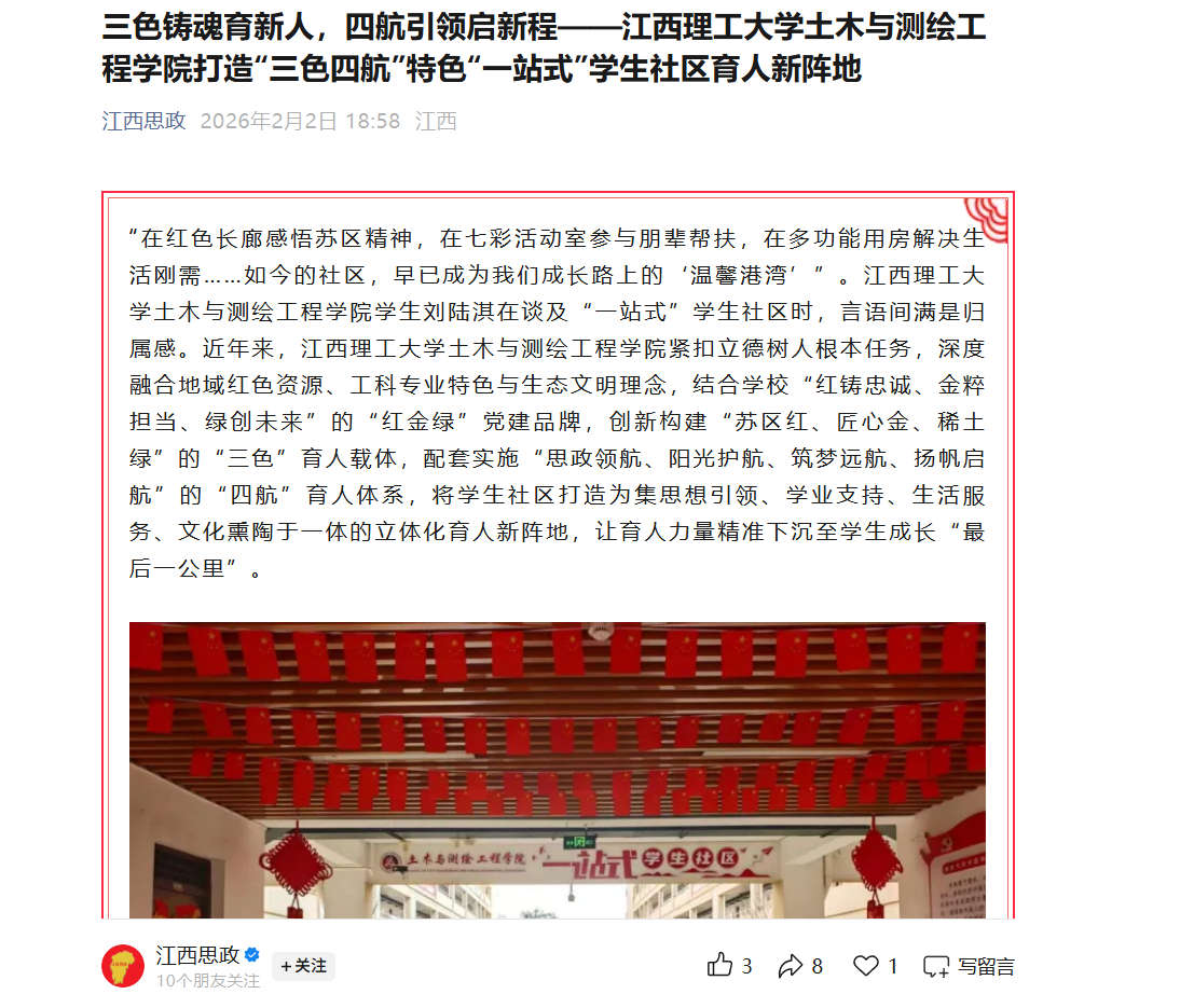 “在红色长廊感悟苏区精神,在七彩活动室参与朋辈帮扶,在多功能用房解决生活刚需……如今的社区,早已成为我们成长路上的‘温馨港湾’”。完美网页版土木与测绘工程学院学生刘陆淇在谈及“一站式”学生社区时,言语间满是归属感。近年来,完美网页版土木与测绘工程学院紧扣立德树人根本任务,深度融合地域红色资源、工科专业特色与生态文明理念,结合学校“红铸忠诚、金粹担当、绿创未来”的“红金绿”党建品牌,创新构建“苏区红、匠心金、稀土绿”的“三色”育人载体,配套实施“思政领航、阳光护航、筑梦远航、扬帆启航”的“四航”育人体系,将学生社区打造为集思想引领、学业支持、生活服务、文化熏陶于一体的立体化育人新阵地,让育人力量精准下沉至学生成长“最后一公里”。
