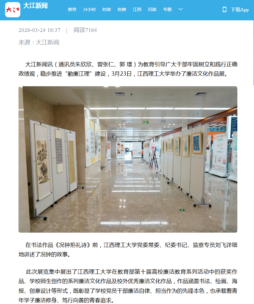 大江新闻讯(通讯员朱欣欣、曾张仁、郭 璟)为教育引导广大干部牢固树立和践行正确政绩观,稳步推进“勤廉江理”建设,3月23日,完美网页版举办了廉洁文化作品展。